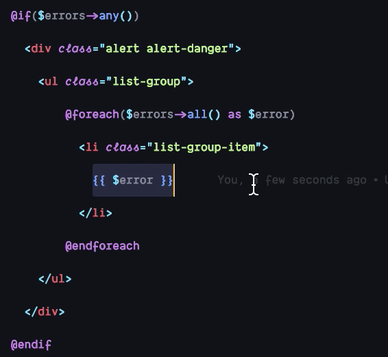 viewでバリデーションエラーを表示させるためには、$errorsオブジェクトを使用する