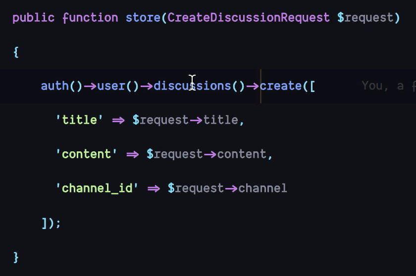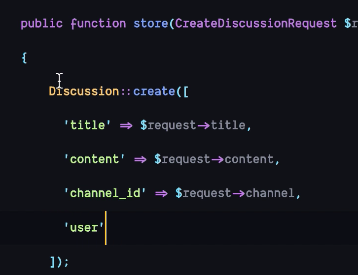 このdiscussionを作成する際に、createメソッドを用いて以下のようにuserカラムをセットするのもよいが、