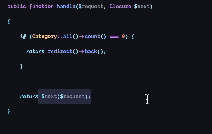 作成されたmiddlewareクラス内にhandleというメソッドがあり、すべてのリクエストがこのメソッド内の処理でフィルタリングされて次のmiddlewareに引き渡されるようになっている